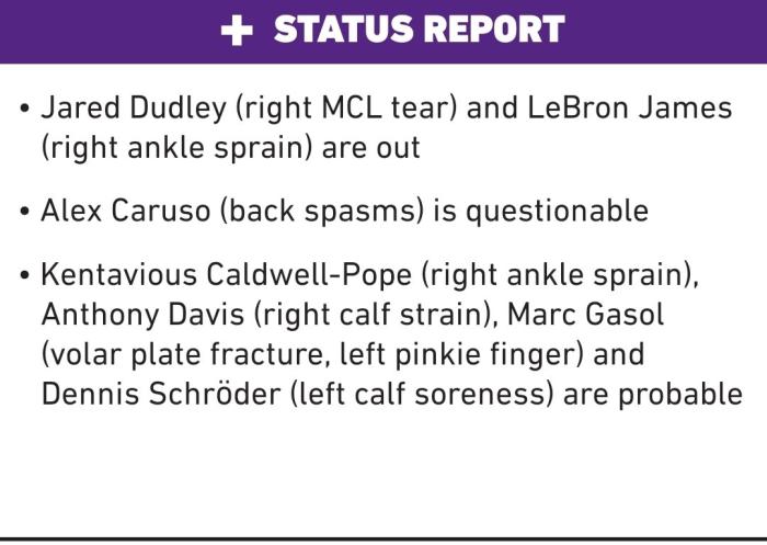 来源:JRS直播网04-30 11:53JRS直播网讯 北京时间4月30日,洛杉矶湖人公布下一场对阵国王的伤病报告,勒布朗-詹姆斯因脚踝扭伤继续休战,卡鲁索被列为出战成疑,浓眉(小腿拉伤)、波普(脚踝扭伤)、小加索尔(手指骨折)和施罗德(小腿酸痛)都是大概率出战。