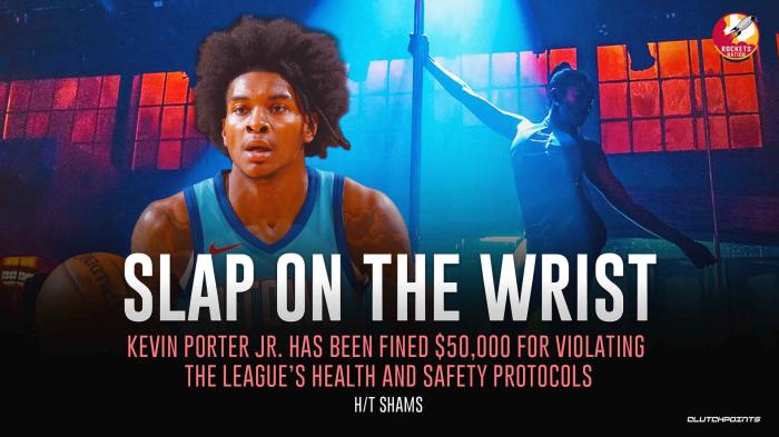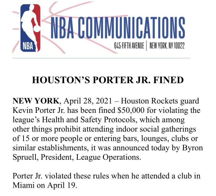 来源:JRS直播网04-29 12:09JRS直播网讯北京时间4月29日,NBA联盟官宣两笔罚单,火箭球员凯文-波特因违反联防疫协议而被罚款50000美元,绿军球员斯玛特被禁赛一场,1人因被殴打而逃出一劫;此前在4月20日,小波特在迈阿密违规逛夜店,斯特林-布朗就是在这家夜店外被殴打,联盟介入调查,最终仅仅只处罚小波特。