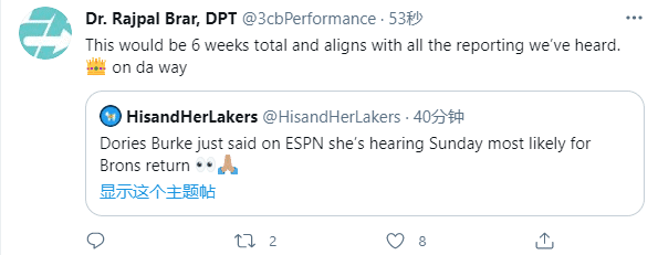 据报道,詹姆斯脚踝伤势康复很好,他有望在一周内重返湖人阵容;接下来湖人的对手依次是国王、猛龙、掘金、快船和开拓者;还有消息爆料,詹姆斯最有可能在下周一对阵猛龙时伤愈复出,医学专家Rajpal Brar转发这一消息,并且写道:刚好是六周,这和我们看到的伤病报告相吻合,詹姆斯在复出的路上。