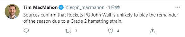 来源:JRS直播网04-27 15:05JRS直播网讯 北京时间4月27日,火箭核心球星约翰-沃尔提前赛季报销,据名记shams报道,火箭后卫沃尔因腿筋拉伤不会出战剩余的比赛,提前赛季报销;随后火箭记者麦克马洪证实,沃尔遭遇腿筋二级拉伤,本赛季不会再为火箭出战。此前篮网球星哈登也是因腿筋伤病而常规赛报销。