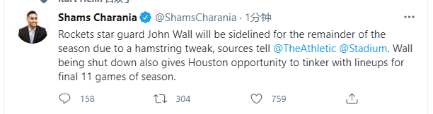 哈登离队之后,火箭瞬间沦为西部鱼腩,战绩糟糕早早无缘季后赛,连续8年杀进季后赛的纪录就此终结;目前火箭还剩下11场比赛,沃尔提前赛季报销,这意味着火箭开始利用剩余赛季演练阵容,换句话说,火箭目标已经变成状元签,不在乎输赢,只在乎挖掘球员,为重建做准备。