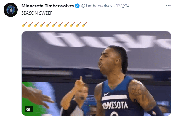 西部倒数第二赛季横扫联盟第一,森林狼有机会再次抽中状元签,摆烂大军导演大逆转并且绝杀对手;森林狼官方晒拉塞尔疯狂表情包庆祝,写道:赛季横扫!