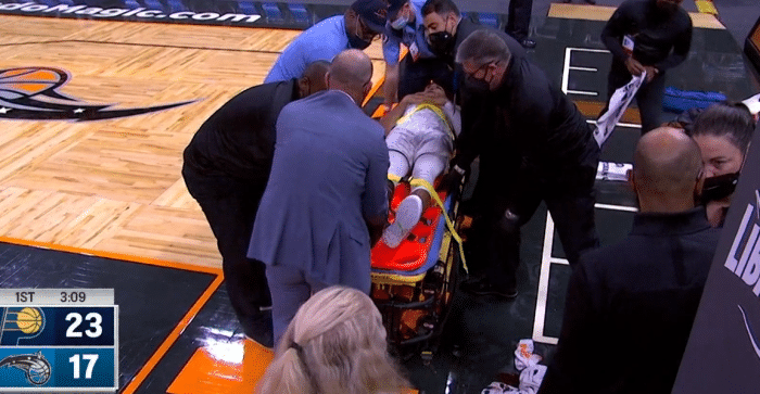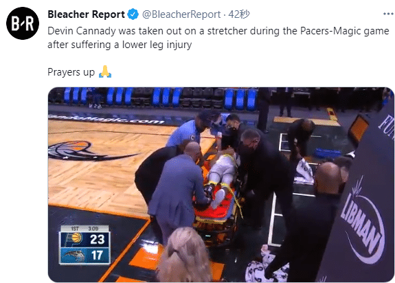 来源:JRS直播网04-26 14:38JRS直播网讯北京时间4月26日,魔术和步行者比赛中,场上发生意外受伤事件,魔术十天短合同球员德文-坎纳迪惨遭重伤,才上场仅打1分钟却不幸重伤离场,小腿严重受伤,被工作人员用担架抬离现场。