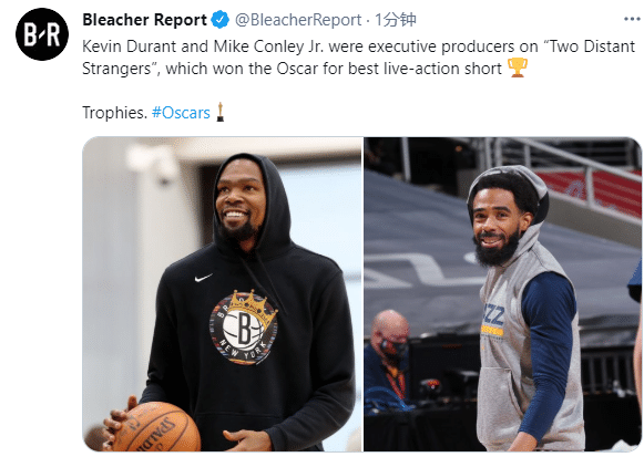 2018年,湖人队传奇巨星科比凭借《亲爱的篮球》获得奥斯卡最佳动画短片,成为首位获得奥斯卡奖的职业运动员,创造了历史,当初科比获奖后直言比赢得冠军更好。在今天的颁奖典礼上,杜兰特和迈克-康利一起获得奥斯卡荣誉,《两个遥远的陌生人》在短片类(真人秀)中获得奥斯卡奖。