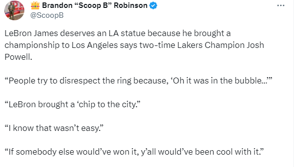 湖人两届总冠军约什-鲍威尔表示詹姆斯值得在洛杉矶拥有一座雕像,因为他为湖人带来了总冠军;约什-鲍威尔表示:人们试图不尊重戒指,因为它是在泡沫中,勒布朗为这座城市带来了冠军,我知道这并不容易,如果其他人赢得了它,你们应该都会对此感到满意。