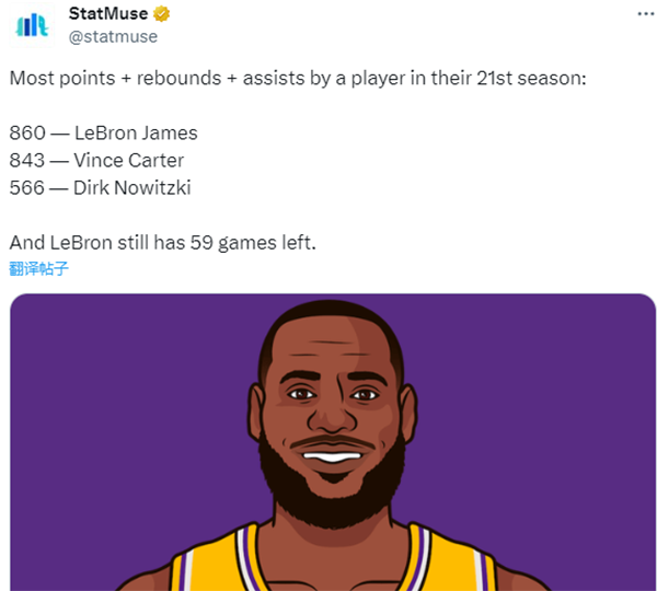 詹姆斯又创历史第一纪录——本赛季至今,詹姆斯“得分+篮板+助攻”总数打到860,超越文斯-卡特(843)成为NBA历史第21个赛季球员中最多。第三是诺维茨基(566);值得一提的是,本赛季湖人还剩59场比赛。