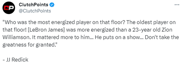 詹姆斯疯狂表现引狂赞,前NBA球员雷迪克表示:詹姆斯昨晚的表现让我眼前一亮,他是场上最有活力、命中率最高的球员。他比23岁的锡安更有活力。看看他的耐力,看看他身上的自豪感,看看他对比赛的热爱。鹈鹕的表现令人失望,除了第一节和第二节之外就没什么表现了,詹姆斯是场上最老的球员却打得最有活力,湖人14胜9负排在西部第四,就是因为勒布朗-詹姆斯,不要把伟大视作理所当然。