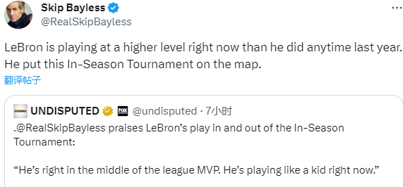著名詹黑Skip在节目中表示:詹姆斯正处于联盟MVP的中间位置,他现在打得像孩子一样充满活力,勒布朗现在的表现比去年任何时候都更好。他让这一次的季中锦标赛名声大噪。