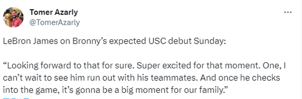 昨天湖人44分大胜鹈鹕晋级决赛后,詹姆斯谈到布朗尼预计下周一迎来大学首秀,老詹表示:当然很期待这一科。那一刻(我肯定)超级兴奋。我迫不及待地想看到他和队友一起上场。一旦他复出参加比赛,这对我们家庭来说将是一个重要时刻,对他自己也是一个重要时刻。