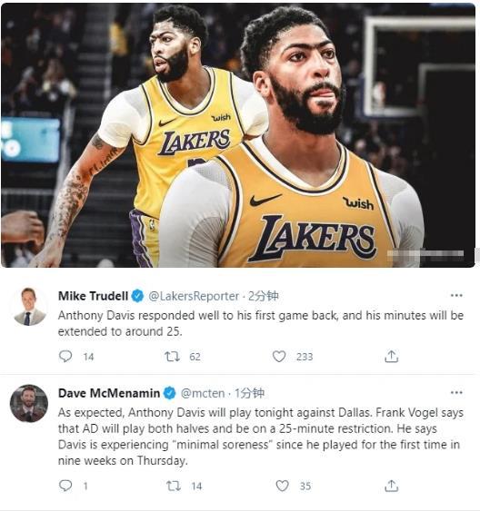 湖人队最近迎来了两个好消息,第一个好消息是复出的浓眉哥打了15分钟,虽然只有4分4篮板1助攻1盖帽1抢断进账,可是4月25日,湖人队主教练沃格尔表示比赛后,浓眉哥只是觉得有点轻微酸痛,他的恢复情况还是非常好的。