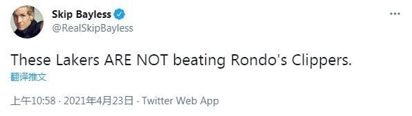 在湖人输掉对阵独行侠的比赛之后,湖人已经在近期遭遇了两连败,而这个Skip又一次抓住了机会嘲讽一下詹姆斯的湖人队。他在社交媒体中发了一句话,他说湖人将没办法击败拥有隆多的快船队。这番话让不少快船和湖人的球迷都感到十分尴尬,因为隆多之前就帮助湖人拿到了总冠军,现在湖人的球迷们对隆多仍然有感情,而Skip就利用了这一点来引起球迷们之间的争论。