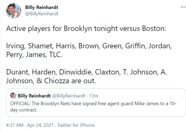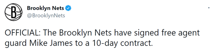 自从阿德突然因病退役后,篮网寻求新的签约目标。此前,篮网总经理肖恩-马克斯曾表示引进中锋还是后卫仍未确定。他想在一周左右的时间进行评估,并作出决定,如今他们终于下定决心,用10天合同引进詹姆斯来补强后场。哈登的腿筋伤势复发以及齐奥扎的骨折,让篮网的后场人手有些不足。