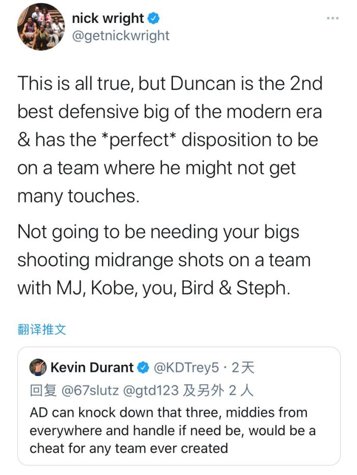 杜兰特评选历史最佳阵容!阿泰发推:我认为邓肯是历史前六的球员!