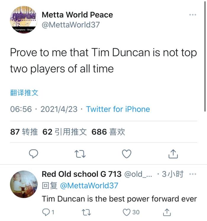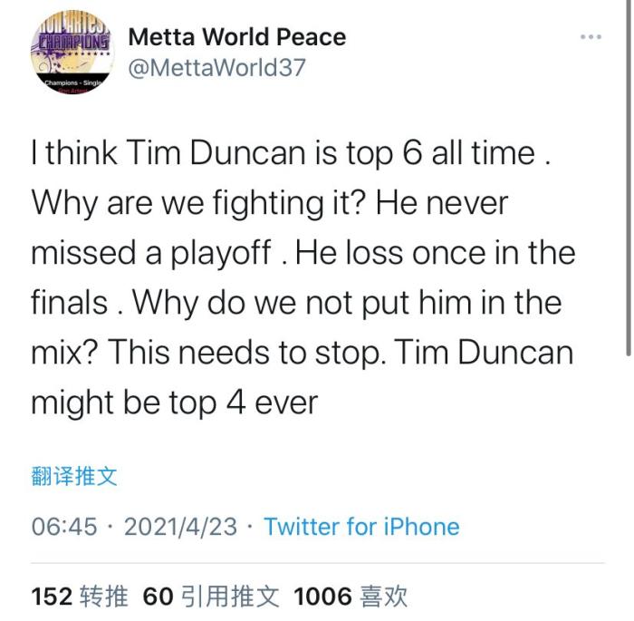 就连昔日的NBA球员阿泰斯特都看不过去了,他在自己的社交媒体中连续发文支持邓肯。阿泰首先说了他认为邓肯就是历史前六的球员,这难道有什么好反驳的地方吗?邓肯从来没有缺席过一场季后赛,而且在总决赛当中只输了一次,为什么不把邓肯算进历史最佳阵容里面呢?而且阿泰还说邓肯甚至有可能排进历史前四,还呼吁大家要禁止忽略邓肯的行为,因为邓肯的实力真的是太强大了。
