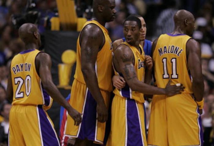 不过,打江山容易守江山难。奥尼尔和球队另外一位球星科比都要面对这个事实,奥尼尔前三年出战场数较多,导致他的脚趾出现伤病。奥尼尔常规赛打打停停,到了季后赛球队不幸被马刺击败。科比这个赛季成长幅度很大,两人的矛盾逐渐被摆上明面。2003~04赛季,湖人引入了卡尔马龙和加里佩顿两位老将,湖人组成名震一时的F4组合。他们闯入总决赛。可是最后他们以1:4输给了底特律活塞。