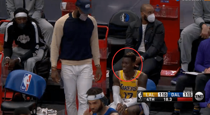 施罗德拼尽全力却早早犯满毕业,心情沮丧坐回替补席,见状36岁詹姆斯主动走到施罗德的身旁,搂着施罗德、贴在施罗德耳旁说了一番话,很明显,詹姆斯是在安慰施罗德,两人交谈一番后,施罗德心情有所缓解,并且露出笑容。