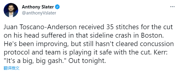 来源:JRS直播网04-22 19:06JRS直播网讯此前勇士和凯尔特人比赛中,勇士悍将托斯卡诺-安德森拼命救球,摔进技术台撞伤脑袋,头部裹着毛巾返回更衣室,安德森这一拼搏精神令人动容;不久前,勇士主教练科尔透露,安德森的脑袋上有一个很大、很大的伤口,缝了35针。