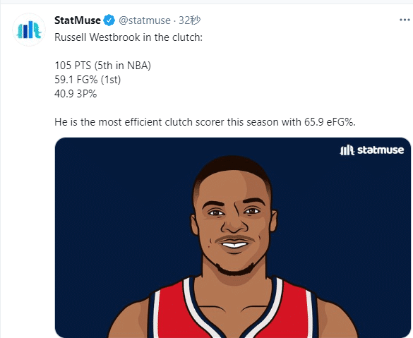 赛季至今,韦少关键时刻总共拿到105分,排在联盟第五位,投篮命中率高达59.1%联盟第一,三分命中率40.9%;美媒Stat Muse发推写道:韦少是本赛季关键时刻有效命中率最高的球员,有效命中率65.9%联盟第一。