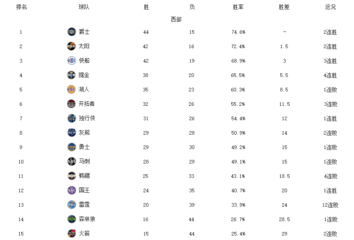 来源:JRS直播网04-22 16:25JRS直播网讯北京时间4月22日NBA常规赛进行了12场比赛,有13支西部球队出战,各队结果不同,战绩榜前列的爵士和太阳都赢球了,勇士惜败给奇才、雷霆、马刺和火箭都输了球,独行侠击败活塞、开拓者不敌掘金、快船大逆转击败灰熊、国王最后1分钟逆转森林狼。接下来我们一起来看看西部最新排名: