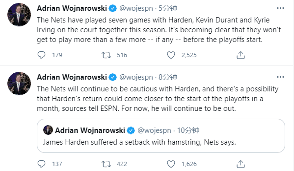 来源:JRS直播网04-21 14:37JRS直播网讯 篮网官宣坏消息,哈登在训练中遭遇不幸,腿筋拉伤的伤势复发,被列为无限期缺阵,没有复出时间表;ESPN名记透露哈登最快也要到季后赛前才能复出;杜兰特伤停,哈登伤势复发,篮网的冲冠赛季真是太难了,就连劳模哈登也惨遭伤病的侵袭。