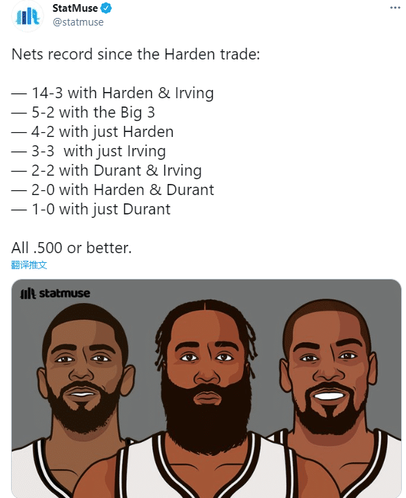 本赛季篮网三巨头杜兰特、哈登和欧文仅仅只在一起打过七场比赛,战绩是5胜2负;美媒统计,哈登出战时篮网战绩是25胜7负,不管是哈登和欧文或者哈登和杜兰特双核带队以及哈登单核带队,篮网战绩都不错。
