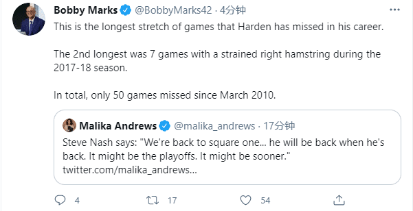 据记者BobbyMarks统计,哈登将由此创造生涯最长的连续缺阵场次纪录。此前的纪录是他在2017-18赛季因右腿筋拉伤,连续缺席7场比赛;自从2010年3月以来,哈登累计仅缺席了50场比赛。