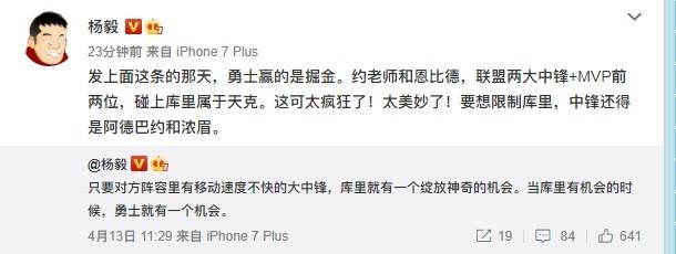 库里10个三分爆砍49+5,狂刷一系列的纪录击溃东部第一76人,几乎场场能投进超过7个三分球,直接打服了一众名嘴和对手,乔治希尔形容“他把球扔给耶稣,接着耶稣把球扔进篮筐。”国内名嘴杨毅被直接打服,更新微博评价“发上面这条的那天,勇士赢的是掘金。约老师和恩比德,联盟两大中锋+MVP前两位,碰上库里属于天克。这可太疯狂了!太美妙了!要想限制库里,中锋还得是阿德巴约和浓眉。”