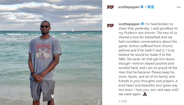皮蓬在社媒上写道:“昨天我悲痛欲绝,我和大儿子安特隆说了再见。我们两人都对篮球充满热爱,关于比赛,我们进行过无数次的交谈。安特隆患有慢性哮喘,如果没有这个问题,我真的相信他会打进NBA。不过,他也从来没有放弃自我,一直积极向上,并努力工作。我为他感到骄傲。请为他的妈妈凯伦以及所有家人朋友送上祈祷和哀思。一颗善良的心和美丽的灵魂过早消逝。我爱你,儿子,安息吧,我们会再次相见。”