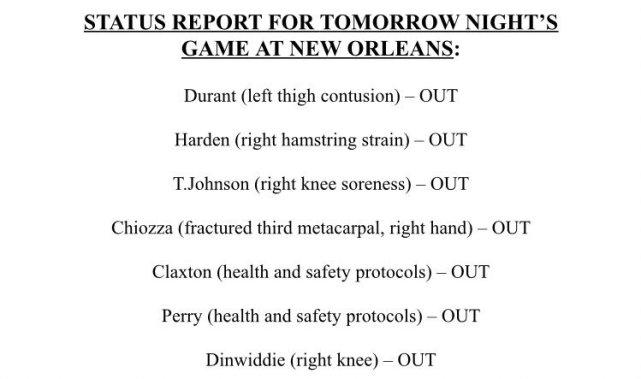 来源:JRS直播网04-20 16:24JRS直播网讯 北京时间4月20日,篮网官方公布了明天客场对鹈鹕的伤病名单,多达七名球员被贴上了OUT(缺席)的标签。杜兰特(左大腿挫伤)、哈登(右腿筋拉伤)、泰勒-约翰逊(右膝酸痛)、齐奥扎(右手骨折)、克拉克斯顿(健康安全协议)、佩里(健康安全协议)、丁威迪(右膝伤病)都不能出战这场比赛。这意味着欧文将单核带队来打这场比赛。
