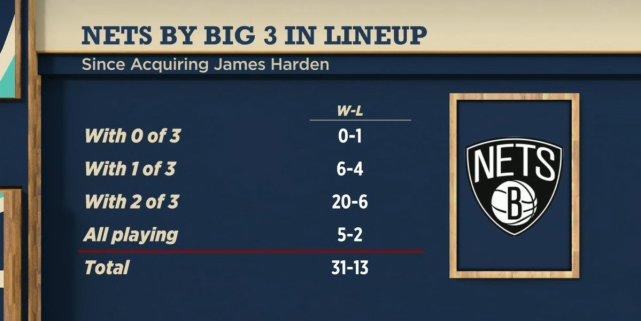 自从哈登加盟篮网后,这支球队就很少有凑足核心阵容的时候。美媒列出了相关的数据,哈登加盟后,篮网三巨头(哈登、杜兰特、欧文)一起出战的比赛只有7场,篮网5胜2负;三巨头中两人出战,20胜6负;三巨头中一人出战,6胜4负;三巨头都没打的比赛,0胜1负。合计是31胜13负。