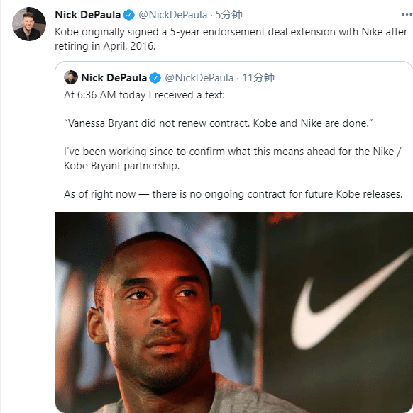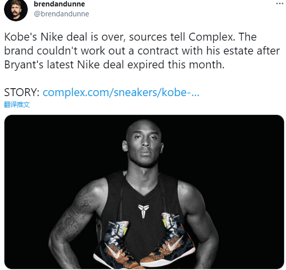 据报道,科比与耐克的球鞋合同已经在2021年4月14日到期,但目前双方还没达成新的签约合同,耐克方面对此没有发表评论,本来耐克计划在2021年出售更多的科比球鞋。
