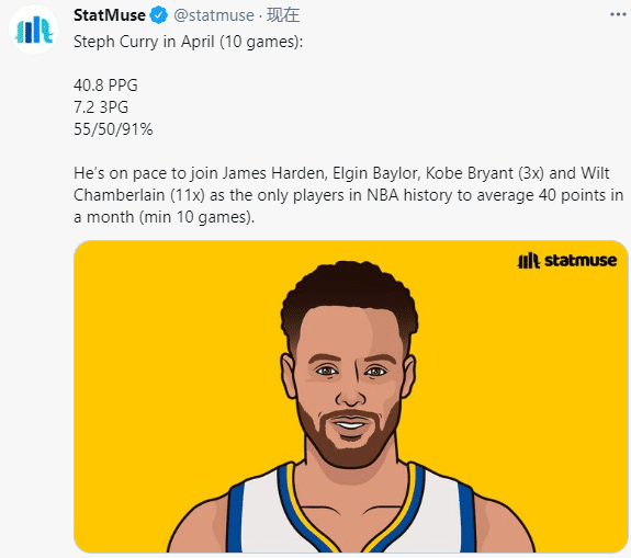 据统计,过去10场比赛库里场均狂砍40.8分,场均命中7.2记三分球,三项命中率分别是55%、50%和91%;库里单月场均40+,加入哈登、贝勒爷、科比和张伯伦单月40+的行列(至少打10场比赛)。