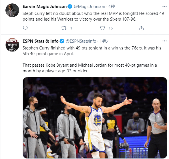 库里疯狂一战瞬间引热议,湖人名宿魔术师发声直言:毫无疑问,库里就是今晚场上的MVP,他轰下49分带领勇士掀翻东部第一。