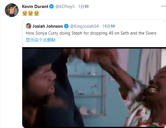 对于库里的疯狂表现,名记晒视频,库里面对赛斯的表现是从抱在一起到突然“大打出手”,对此杜兰特转发并且发推:三个大哭的表情。