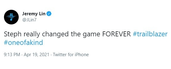 库里的前队友林书豪也在社交媒体上表示“库里真的永远改变了比赛 #开创者#独一无二的。”很显然林书豪也在一直关注着老东家和好友的比赛,而库里的表现额令林书豪折服。