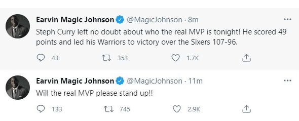 湖人传奇魔术师约翰逊连续发推称赞库里:请真正的MVP起立!!!