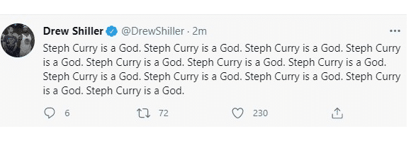 除了球迷和名宿之外,美媒也是盛赞库里的表现,媒体人Drew Shiller直接疯狂,他连发12次“库里是神!”确实是情绪很激动。