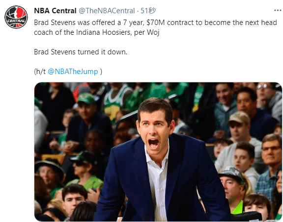 来源:JRS直播网04-18 15:30JRS直播网讯北京时间4月18日,据ESPN名记沃纳罗斯基报道,凯尔特人主帅布拉德-史蒂文斯拒绝了一份来自印第安纳大学7年7000万美元的主教练合同;少帅拒绝7年7000万美元大合同,年薪高达千万美元,目前史蒂文斯年薪不详,去年他和球队达成提前续约合同。