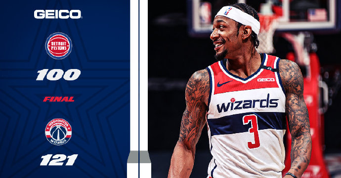 奇才(23-33):比尔37分3篮板3助攻,威斯布鲁克15分14篮板11助攻2抢断;史密斯16分3篮板5助攻;洛佩兹15分5篮板3助攻;加福德8分8篮板4封盖。