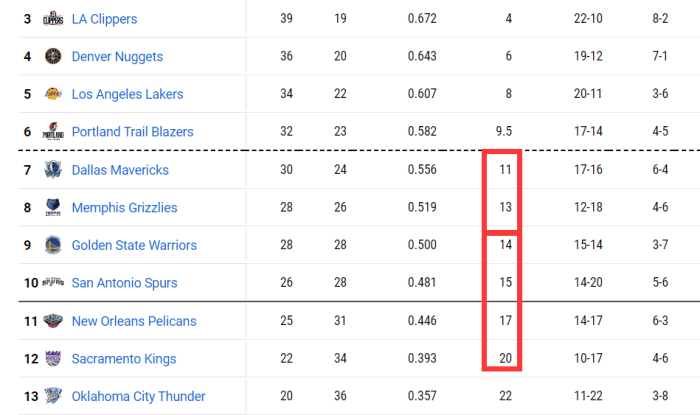 可以看到,在鹈鹕和马刺都输球后,第9的勇士领先马刺1个胜场,领先了鹈鹕3个胜场,领先国王则是多达6个胜场!