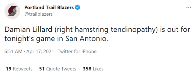 利拉德一直是联盟里的铁人之一,上赛季,他场均出战37.5分钟,上场时间排名联盟第一。这只是他本赛季缺席的第三场比赛。赛季至今,这位30岁的全明星后卫场均28.7分7.7助攻,投篮命中率44%,率领开拓者取得31胜23负的战绩,目前暂居西部第六。