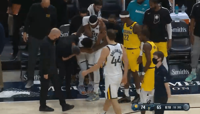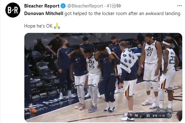 第三节,米切尔在一次抢球落地时,不幸扭伤脚踝,随后米切尔坐在地板上,起身之后十分痛苦,抱住队友罗伊斯-奥尼尔,右脚已经无法用力,缓了一会后,米切尔一瘸一拐,被两人搀扶离场;伤情初步确诊为右脚踝扭伤,没有出现骨折的情况,ESPN名记沃纳罗斯基还透露爵士内部相信米切尔脚踝伤势不是太严重。