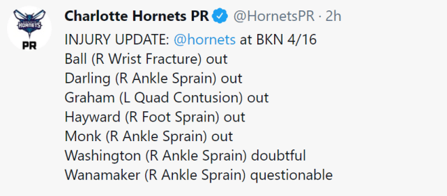 篮网的对手黄蜂正遭遇严重的伤病危机,球队PR也已经公布明天比赛的伤病名单:三球(右腕骨折)、达林(右踝扭伤)、格拉汉姆(左四头肌挫伤)、海沃德(右脚扭伤)、蒙克(右踝扭伤)都不会出战,华盛顿(右踝扭伤)大概率也不打。沃纳梅克(右踝扭伤)出战几率50%。
