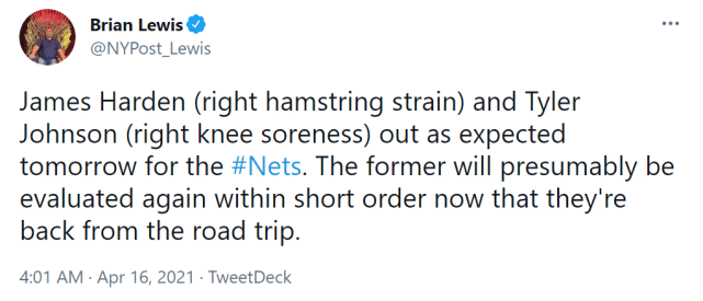 来源:JRS直播网04-16 15:38JRS直播网讯北京时间4月16日,篮网公布了明日对黄蜂一战的伤病名单。哈登(右腿筋拉伤)和泰勒-约翰逊(右膝酸痛)将缺席比赛,掌骨骨折的齐奥扎和十字韧带部分撕裂的丁威迪也不会出场。哈登受伤时,篮网曾宣布他将在10天后接受复查,对黄蜂一战正好是第10天,他已经确定缺席这场比赛,具体回归时间有待新的评估。