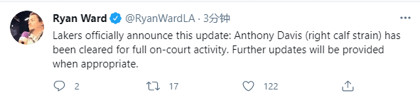 来源:JRS直播网04-16 14:57JRS直播网讯湖人巨头终于要复仇了,湖人对阵凯尔特人赛前,沃格尔透露安东尼-戴维斯已经获得参加球场完整训练的许可,这意味着浓眉小腿伤势已经痊愈,虽然接下来几场比赛,浓眉不太可能出战,但这是浓眉复出的重大利好;湖人也已官宣这个喜讯。