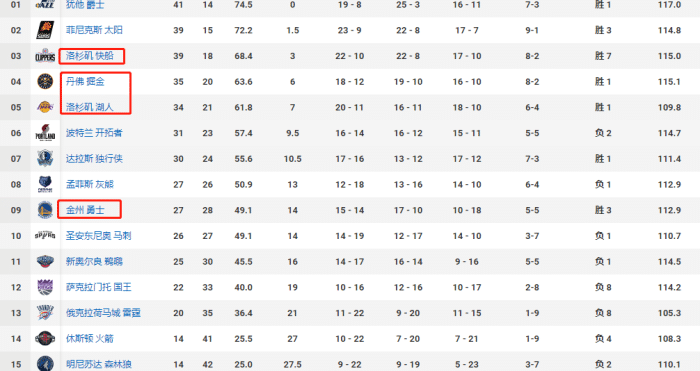 西部排名:快船7连胜原地不动,掘金强硬湖人争4难了,勇士有突破
