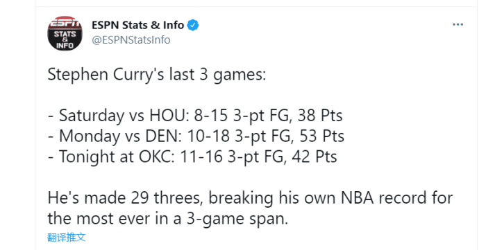 最疯狂的是,库里今天只用了三节就命中11记三分,上一场击败掘金他命中了10个,而再上一场赢火箭的比赛,萌神也有8个三分进账!也就是说,库里在连续三场比赛中足足命中了29记三分!据ESPN统计,库里就此打破了自己此前的纪录!成为NBA历史上在连续3场比赛中命中三分最多的球员!