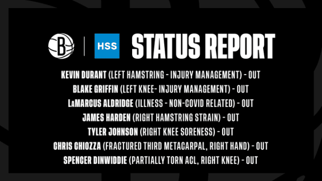 来源:JRS直播网04-15 16:37JRS直播网讯 北京时间4月15日,篮网官方公布了对战费城的伤病名单,多达7名球员将缺席这场东部榜首之争,具体名单如下:杜兰特(左腿筋伤病管理)、格里芬(左膝伤病管理)、阿尔德里奇(生病,和新冠无关)、哈登(右腿筋拉伤)、泰勒-约翰逊(右膝酸痛)、齐奥扎(右手第三掌骨骨折)、丁威迪(右膝十字韧带部分撕裂)。