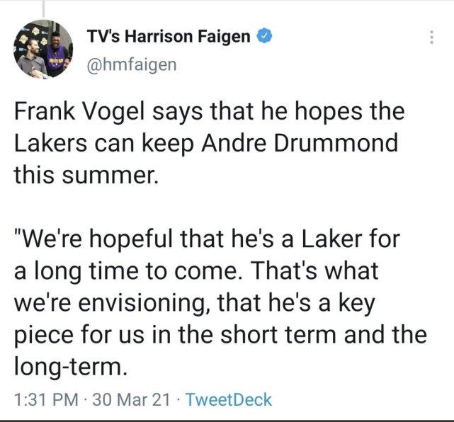 当时沃格尔说他希望湖人在今年夏天能留住德拉蒙德。“我们希望他在未来很长一段时间内都是一名湖人球员,那是我们期待的,无论短期还是长期。他都是我们的一块关键拼图。”