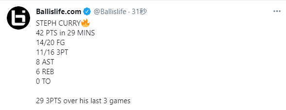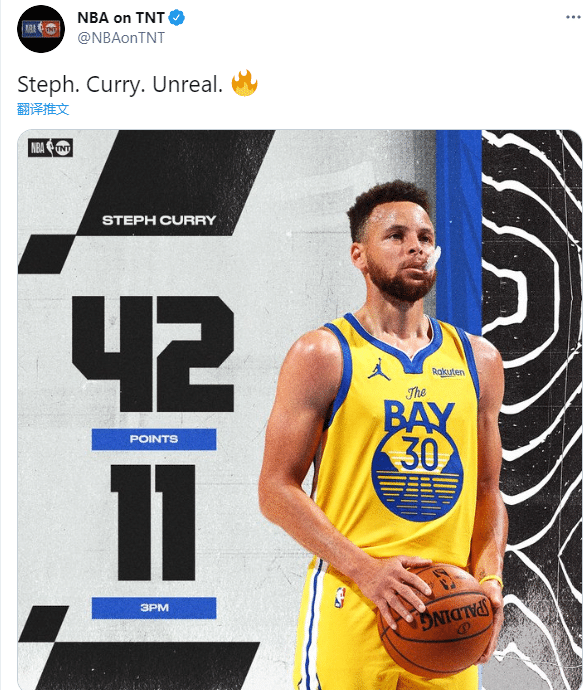 库里29分钟11记三分狂砍42分,最近三场疯狂投进29记三分球;美媒疯狂转发库里疯狂一战的数据,NBA on TNT发推写道库里太梦幻、太不真实了;露天看台发推晒库里近8场数据,直呼太梦幻。